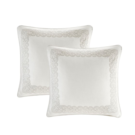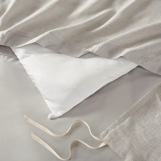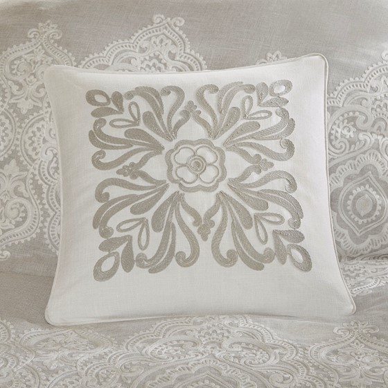 Madison Park Signature’s Barely There 8 Piece Comforter Set provides a chic and charming update for the bedroom. Oversized and overfilled for maximum warmth and comfort, the textured comforter features a beautiful white chain stitch embroidery in an intricate damask pattern and natural palette of grey and beige. The solid natural reverse pairs well with the top of bed design, while shams in coordinating colors and simple trim complement the overall look. Two white Euro shams feature embroidered borders in a natural hue that add an elegant and sophisticated touch. A trio of decorative pillows, each with a distinct embroidered pattern or textural detail, round out the gorgeous bedding set. This comforter uses a removable duvet-style insert that is secured by inner ties and a hidden button closure. This provides no visible bartacking lines on top of the bed to create a smooth, clean face. Dry clean comforter cover only and machine wash comforter filler.
