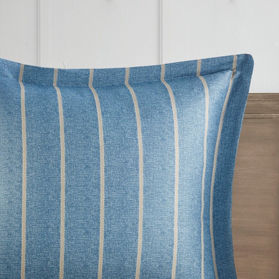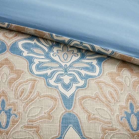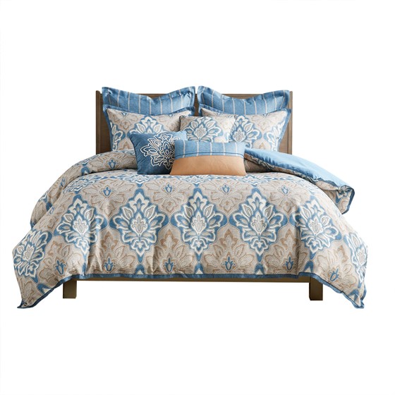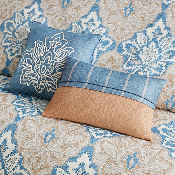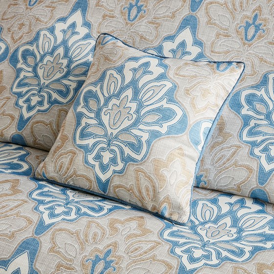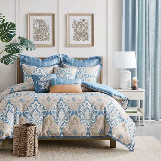 Madison Park Signature’s Caspian 9 Piece Medallion Print Comforter Set introduces an elegant traditional updated to your bedroom. The jacquard comforter features a distressed medallion print on textured ground fabric in shades of blue, ivory, and taupe, for an elevated coastal look. The oversized and overfilled comforter uses a removable duvet-style insert that is secured by inner ties and a hidden button closure. This provides no visible bartacking lines on top of the bed to create a smooth, clean face. Also included are 2 matching shams and 3 Euro shams that coordinate beautifully with the luxurious comforter. An oblong decorative pillow and 2 square decorative pillows showcase printed and embroidered designs on textured fabric removable covers to provide the finishing touches to this luxuriously elegant comforter set.