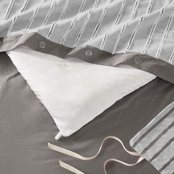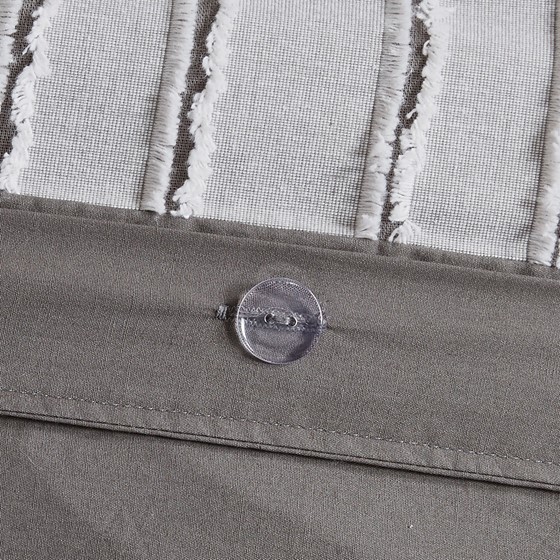 This farmhouse styled cotton clip jacquard comforter features a pieced design with striped pattern and decorative buttons, for a casual look. Two matching shams and two coordinating Euro knit shams (3 in King size) complement the top of the bed. Also included are three decorative pillows: one knit square, one trimmed square with embroidery details, and one carpet stitch oblong with decorative embroidery details that add the finishing touches to this set. This oversized and overfilled comforter uses a removable duvet-style insert that is secured by inner ties and a hidden button closure. This provides no visible bartacking lines on top of the bed to create a smooth, clean face. It comes in 2 colors including an ivory on natural light taupe ground or a white on grey ground.