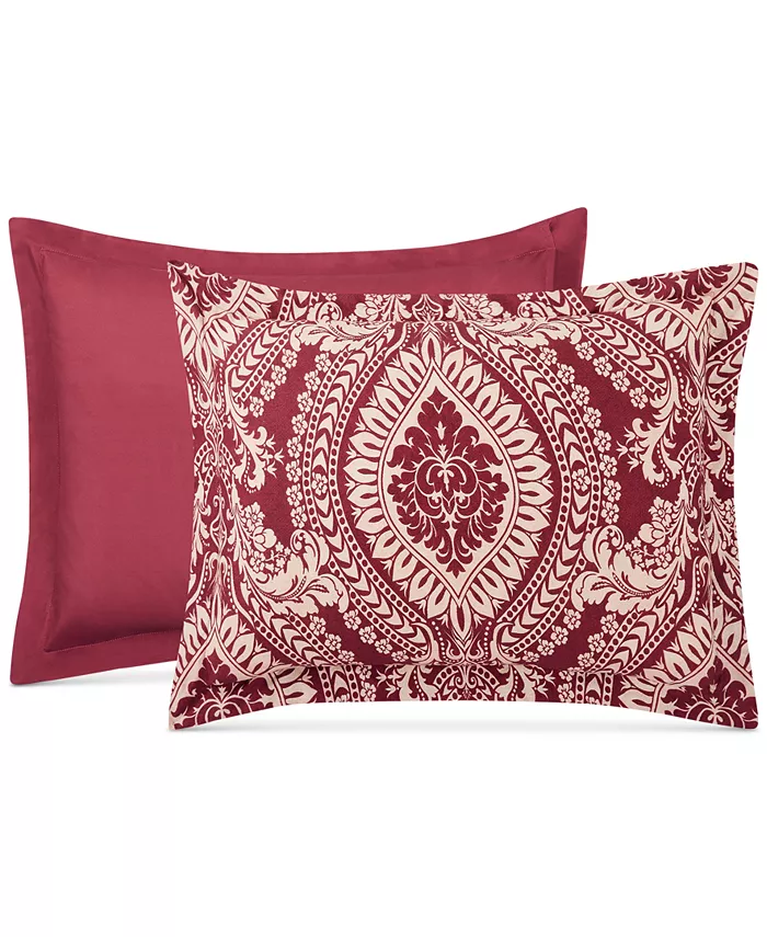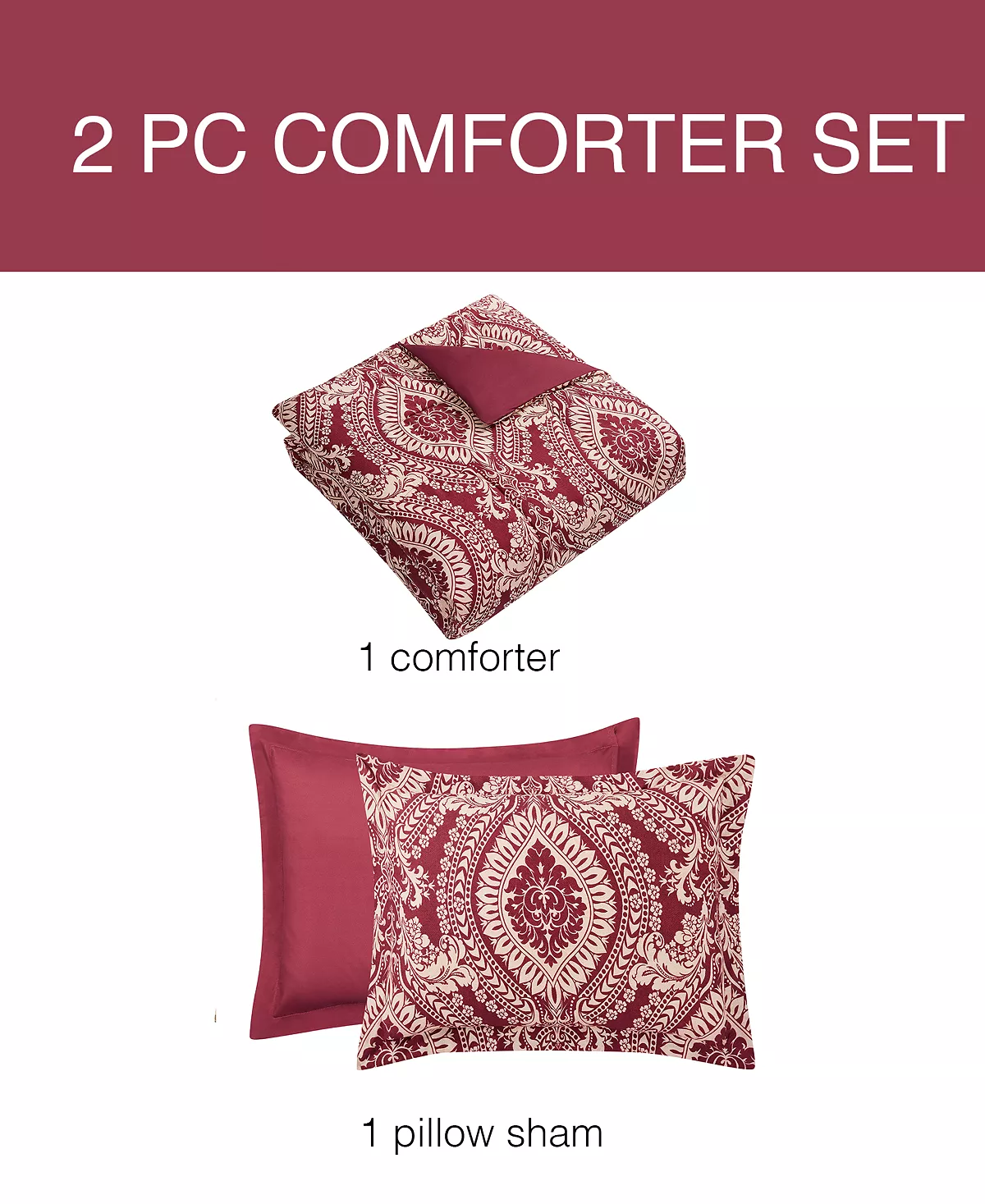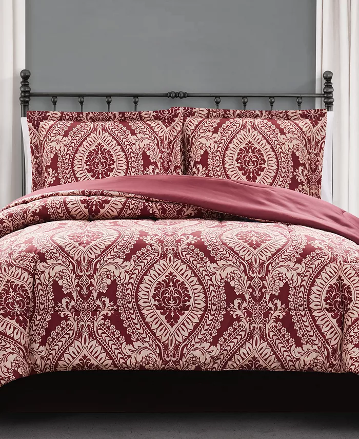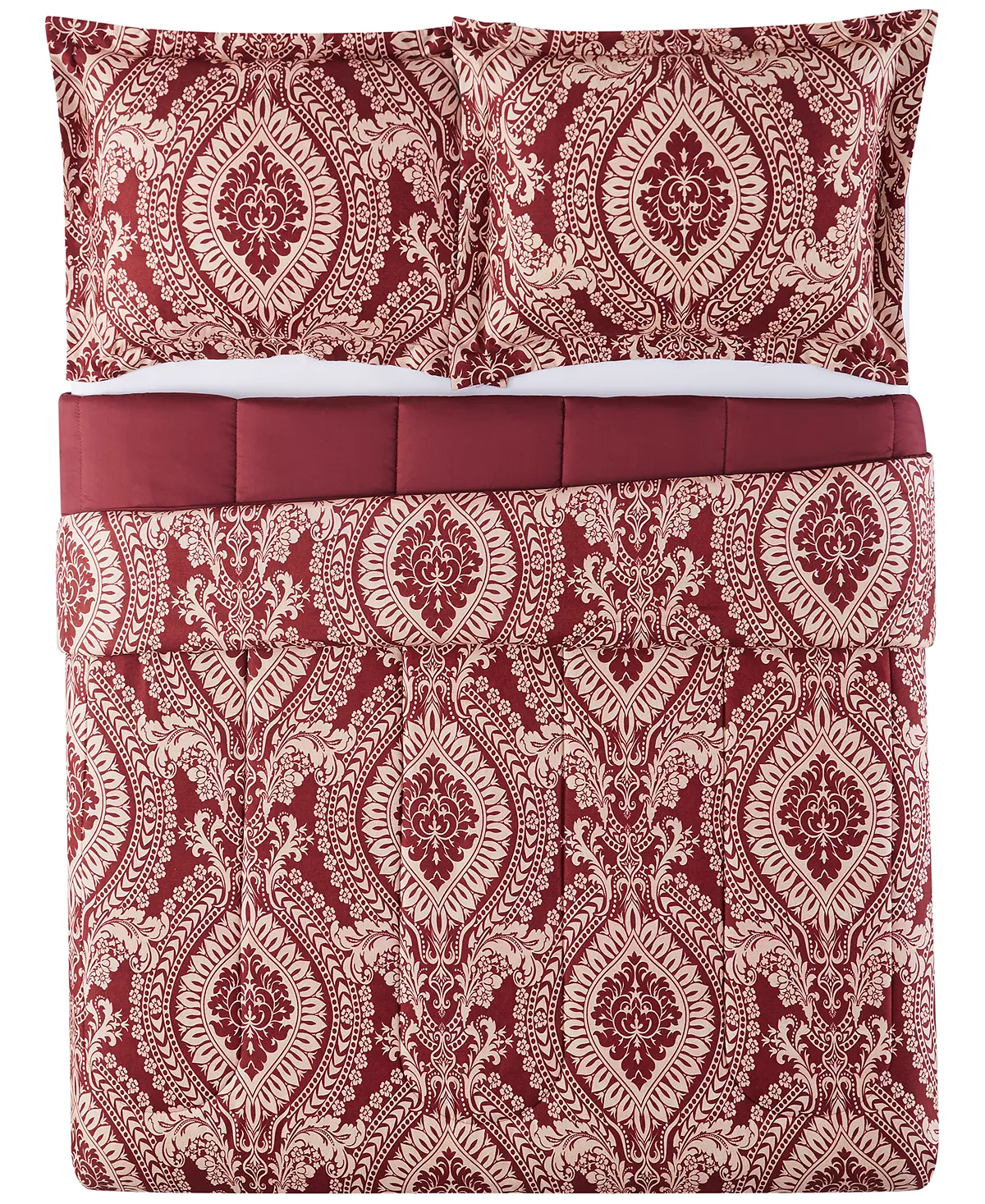 Add some statement-making style to any bedroom with the striking ogee medallion pattern printed on this bold red-and-gold Jessa reversible comforter set.